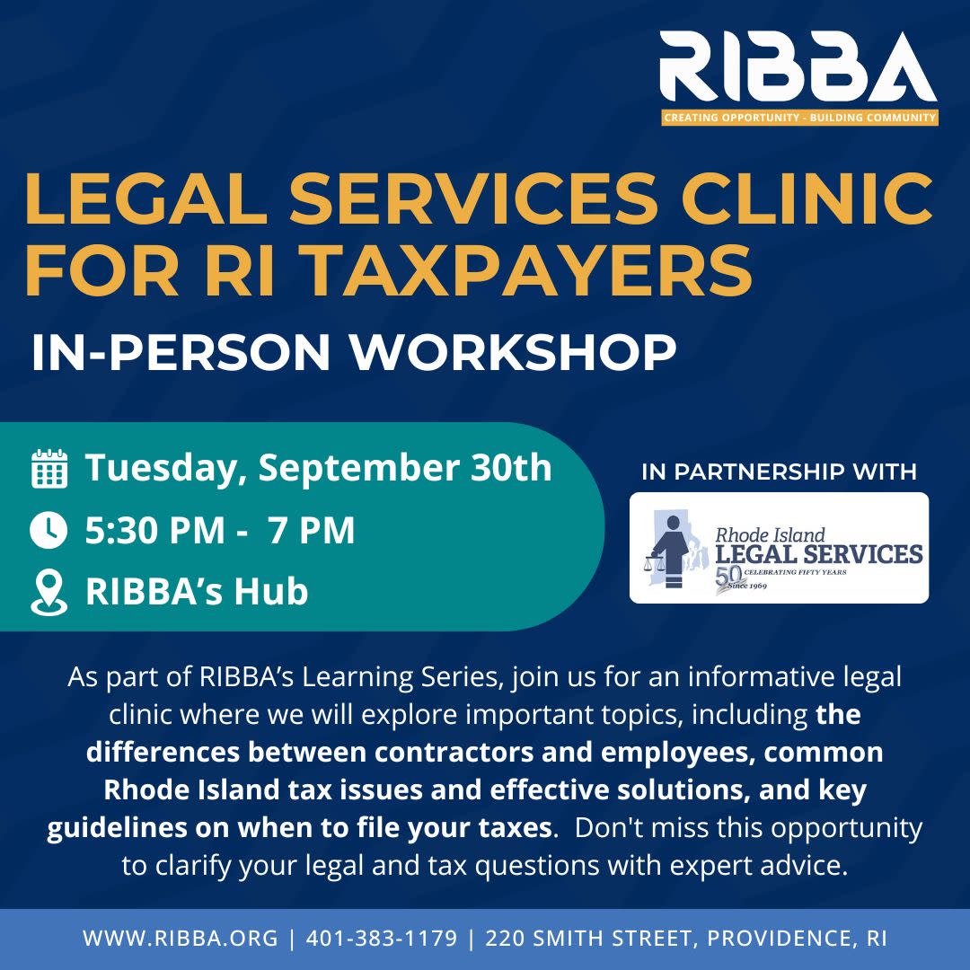 As part of RIBBA’s Learning Series, join us for an informative legal clinic where we will explore important topics, including the differences between contractors and employees, common Rhode Island tax issues and effective solutions, and key guidelines on when to file your taxes. Don't miss this opportunity to clarify your legal and tax questions with expert advice.
