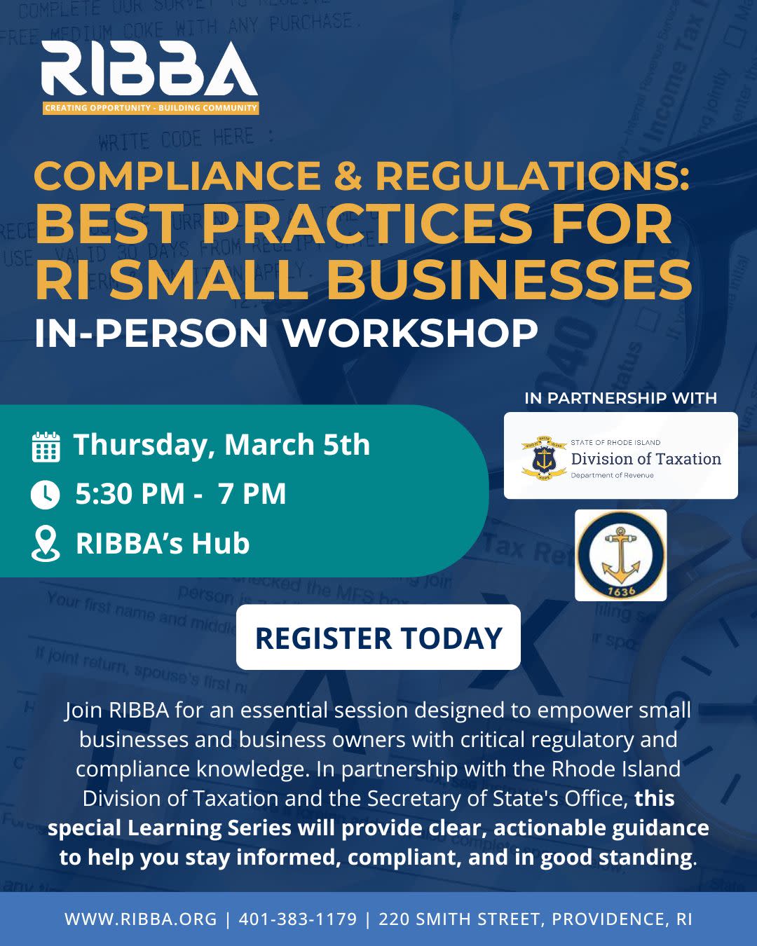 Join RIBBA for a session designed to empower small businesses owners with critical regulatory and compliance knowledge. In partnership with the Rhode Island Division of Taxation and the Secretary of State's Office, this special Learning Series will provide clear, actionable guidance to help you stay informed, compliant, and in good standing.